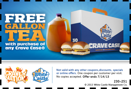 White Castle: Free Gallon of Iced TeaGet a FREE gallon of Iced Tea when you buy a Crave Case (Exp 7/14)