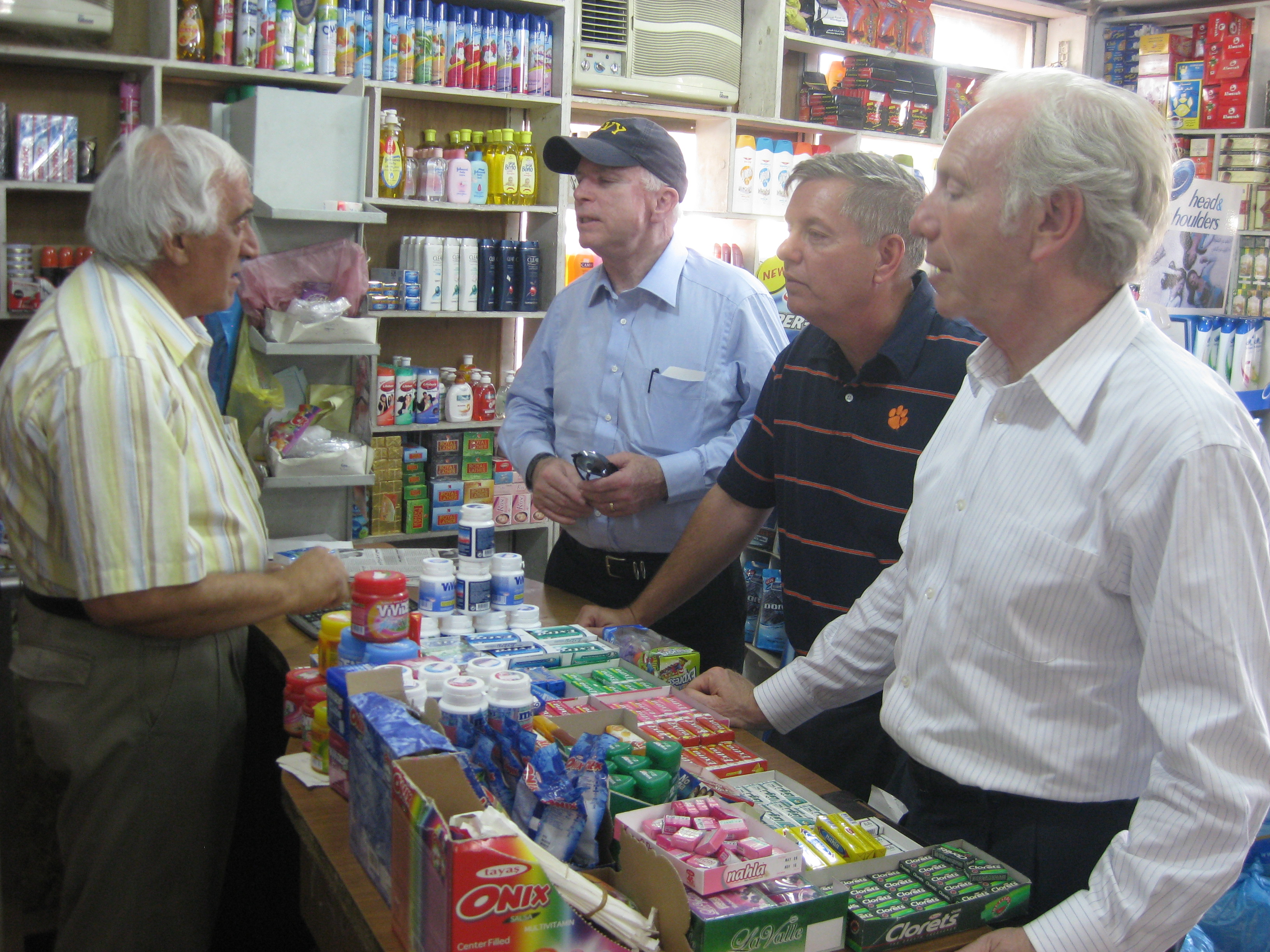 Senators John McCain, Joe Lieberman, and Lindsey Graham stop by a local Baghdad bakery.